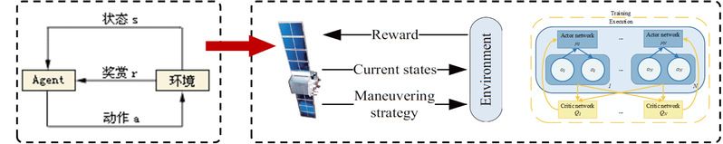 (2)多智能体强化学习博弈技术 为解决空间复杂环境下集群卫星的自主对抗难题,采用多智能体强化学习范式,构建兼具高精度与强泛化能力的策略价值网络,通过“集中训练、分散执行”等先进架构,训练集群智能体在模拟的强对抗场景中学习协作、竞争等高级博弈行为,最终实现集群在真实空间环境中快速、自主的分布式决策。