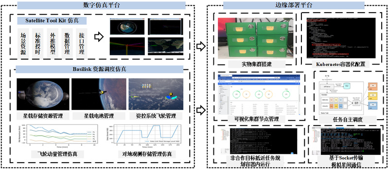 为攻克智能集群算法“在轨真实部署”前的核心验证瓶颈,基于Kubernetes云原生架构,构建高保真“云-边-端”异构集群数字孪生平台。该平台通过异构节点资源池化、跨主机网络通信模拟及一体化可视化管控,精准复现了在轨环境下的计算、通信与资源约束,支持各类自主任务规划算法在贴近真实的边缘端进行功能与性能验证。