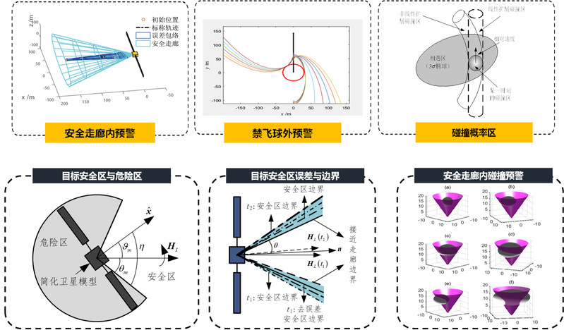 针对卫星集群的轨迹安全问题,聚焦自主安全预警技术,包括:动态安全走廊的智能构建、基于非线性相对动力学的快速碰撞概率计算、以及禁飞球外的分布式协同预警机制,以解决在轨实时感知、风险评估与规避决策一体化的核心难题,确保集群飞行的本质安全。