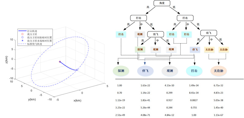 (2)非合作目标意图分析 针对空间非合作目标飞行意图的动态感知与预测问题,构建一种时空因果作用模型。通过设计不同的目标态势感知函数,并生成与之关联的层级决策树,实现对隐蔽意图的动态、可解释推理,确保研判过程的每一步均可追溯。