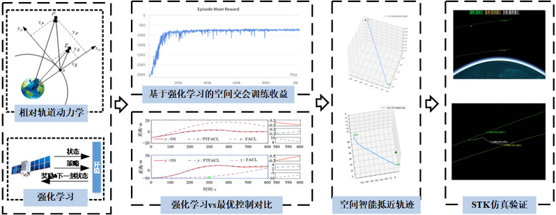已取得成果简介: 1. 非合作目标接近机动规划 (1)空间飞行器自主机动规划 为应对空间非合作目标的在轨智能博弈问题,构建融合动力学建模、智能规划与仿真验证的自主决策技术链,系统开展基于微分对策的机理驱动方法,与基于强化学习的数据驱动方法的对比研究,明晰两类方法在求解精度、计算效率、环境适应性等方面的内在机理、优劣特性,为实际空间机动规划技术实现提供坚实的理论依据。