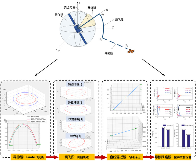 (3)空间在轨操控技术 针对对空间非合作目标的在轨操控问题,研究对目标进行抵近变轨、绕飞控制、悬停跟踪等在轨操控技术,为空间目标的近距离详查、特性识别与行为研判提供技术支撑,为空间智能自主与博弈对抗技术提供验证基础。